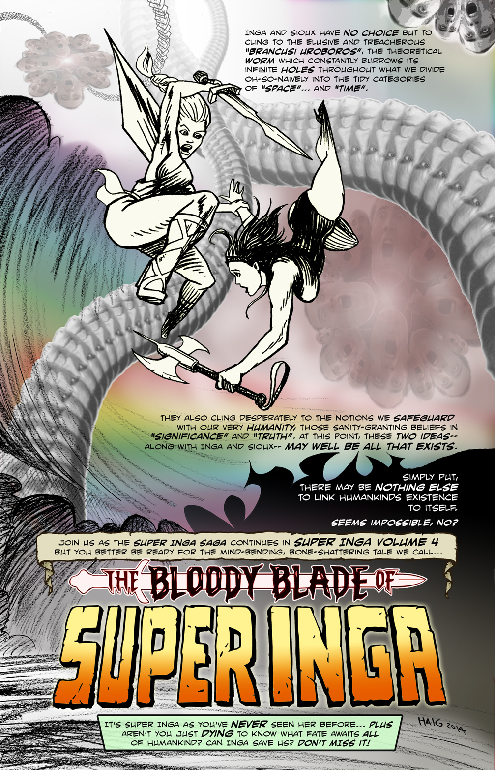 Well, I sure hope you’ve enjoyed Super Inga Episode III, her first ever ongoing webcomic. As you can tell by this CLIFFHANGER ENDING, there’s plenty more to come! Now… you’re no dummy (after all, you’re a faithful Super Inga subscriber!) so you can probably guess that Volume 4 will take Inga’s savage sword-swinging action to a whole new level. But it’s not as simple as that. In fact, it’s never as simple as it seems in Inga’s world… her universe, the “Ingaverse” if you will, is about to get a whole lot more expansive and you’ll be able to watch it unfold in a plethora of uncharted directions.